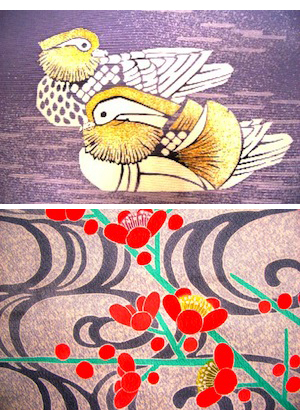 京都の庭園や自然を愛し、花鳥風月に材を求めた作風。特に鴛鴦(おしどり)の文様は、独特のデザインとして高い人気を集めています。野の草花を、豪華な文様にデザインして、京友禅の世界に、加賀友禅を融合させた独自の境地を開きました。京都府民を代表してダイアナ妃に振袖を送られたり、祇園祭蟷螂山の懸装品、内外での展覧会で活躍されています。
